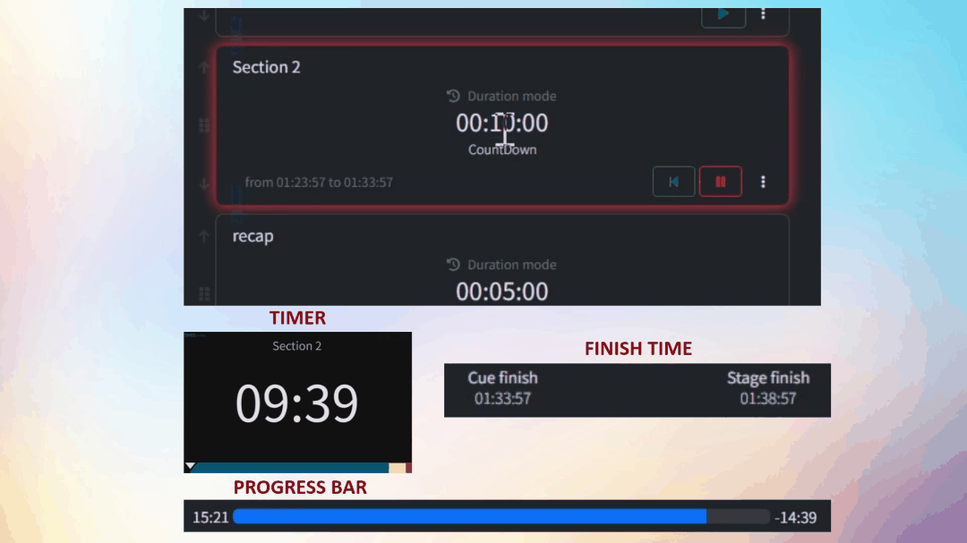 In broadcasts with a fixed end time or those that accept questions, showing viewers the remaining time is especially important. If the content runs longer than planned, the timer can be quickly adjusted, instantly recalculating the overall scheduled end time down to the second.